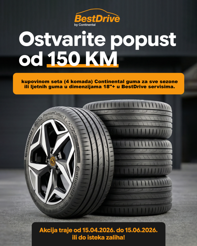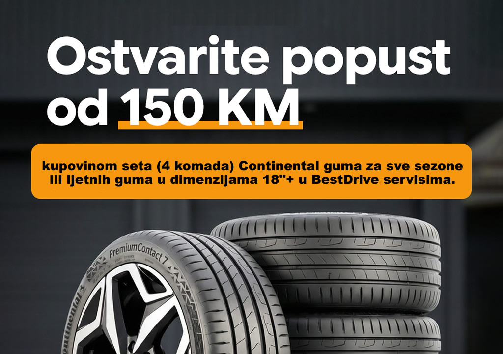 - Kupovinom seta od 4 komada Continental guma za sve sezone (All season) ili ljetnih guma u dimenzijama 18” + u BestDrive servisima ostvarujete popust od 150 KM;