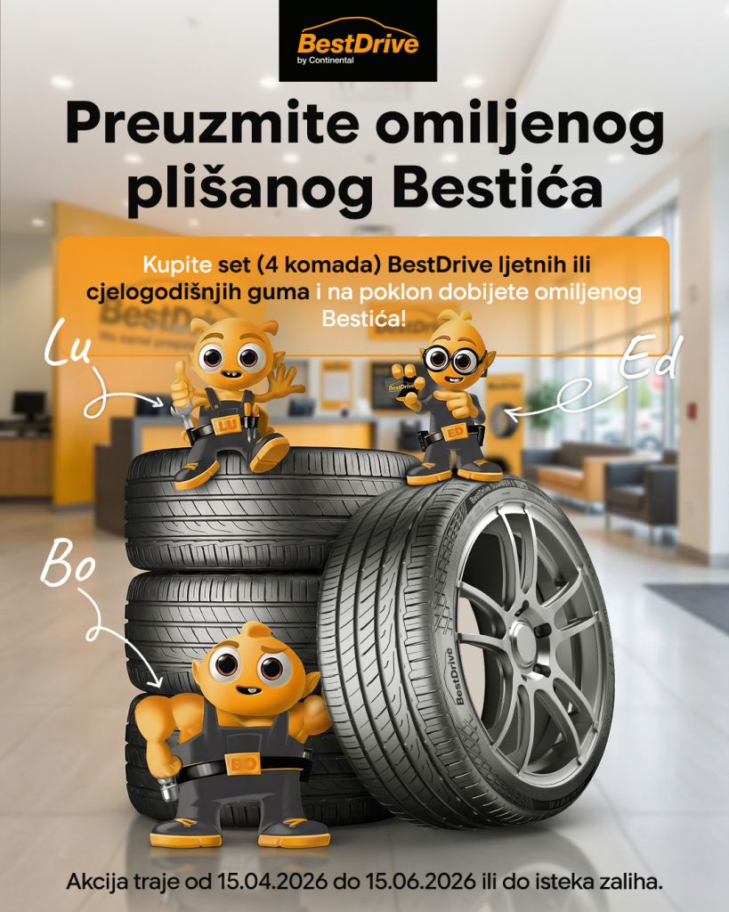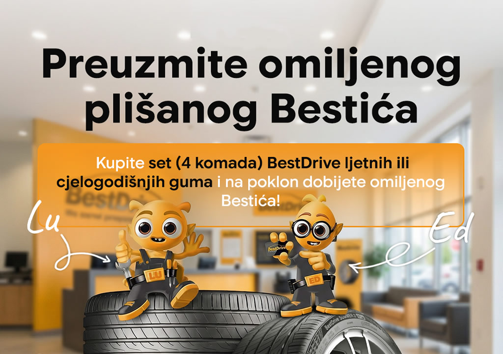 - Kupovinom seta od 4 komada BestDrive ljetnih ili cjelogodišnjih (All season) guma u BestDrive servisima na poklon dobijate omiljenog plišanog Bestića;
